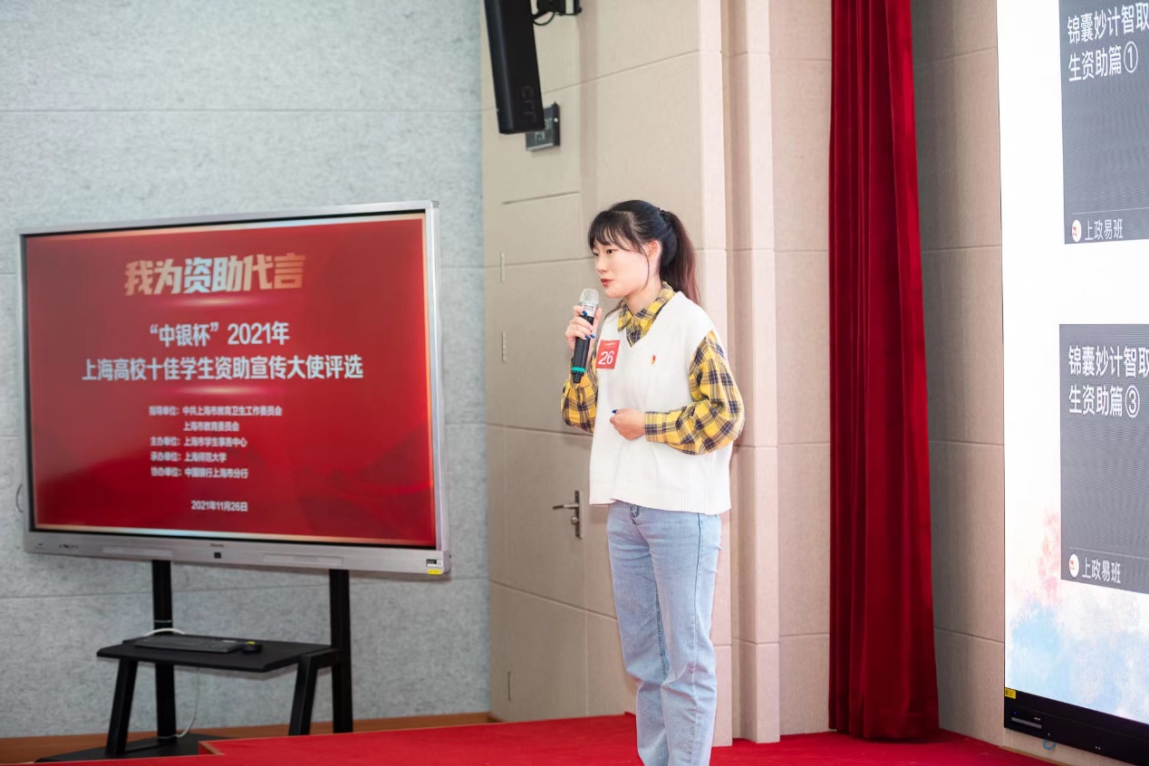 11月26日,由上海市教育委员会、上海市学生资助管理中心主办,上海师范大学承办的“我为资助代言”——2021年“中银杯”上海高校资助宣传大使比赛拉开帷幕,全市共有29所高校进入决赛。我校经济管理学院审计18282班陈安妮同学代表我校参赛,荣获一等奖并成功入选“十佳大使称号”。