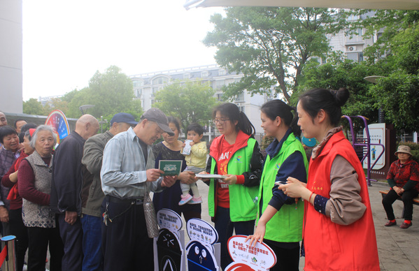 志愿者们同居委会志愿者一起来到社区广场开展了环保宣传活动(王成汉 撰稿、摄影)