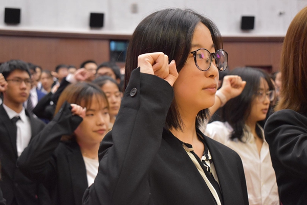 朱慧博介绍第二届进博会志愿者工作概况;国际法志愿者李弈萱带领160名志愿者集体宣誓,表达“追求卓越、护航进博”的决心;王守芬寄语志愿者,鼓励同学们不忘初心,牢记使命,全情投入进博会志愿服务,力争圆满完成各项任务。