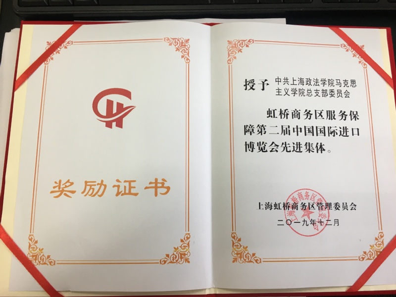 2019年12月30日,虹桥商务区服务保障第二届进口博览会总结表彰大会在虹桥商务区公共事务大厦2楼多功能厅举行,我校马克思主义学院党总支受邀参加本次表彰大会,并被授予虹桥商务区服务保障第二届中国国际进口博览会先进集体荣誉称号。