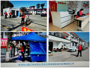 支部书记张燕同志带头响应虹口区欧阳街道欧五小区关于“争做一小时防疫志愿者,守护家园”的倡议,于2月19日开始主动申请参加了欧五小区的封控守护工作;副书记潘高荣同志在返沪完成居家隔离后立即向社区提出了参加志愿工作的申请,不仅参加了所在江秋新苑社区的大门封控、出入人员检查等工作,而且在了解到松江区石湖荡镇新姚村外来人员多,防控任务重的情况后,主动与该村党总支书记取得联系,参与了村里的道路进出口防控、防疫宣传等工作;支部其他党员干部也都主动向所在小区了解疫情防控形势,积极向社区及居委提出了志愿申请。