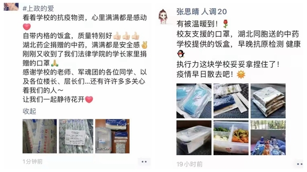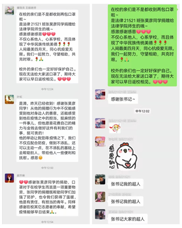 法律学院师生在得知此次抗疫物资是身边的同学所捐赠时,纷纷为张昊彦同学的行为点赞,自发地通过各类渠道表达对张昊彦同学的感谢。