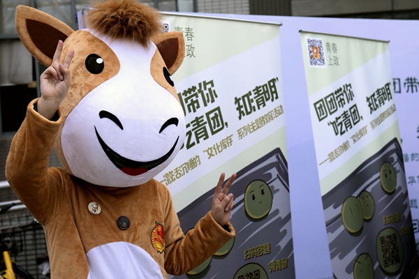 4月3日中午,同学们在世博广场摆开宣传展位,由上政青年的吉祥物小野马“团团”向过路的同学们介绍清明节令风俗,发放青团。同学们纷纷驻足、扫码答题,不仅对清明节的起源、时间、习俗都有了更加深刻的认识,同时还领到了软糯可口的青团,共同品尝春天的滋味。
