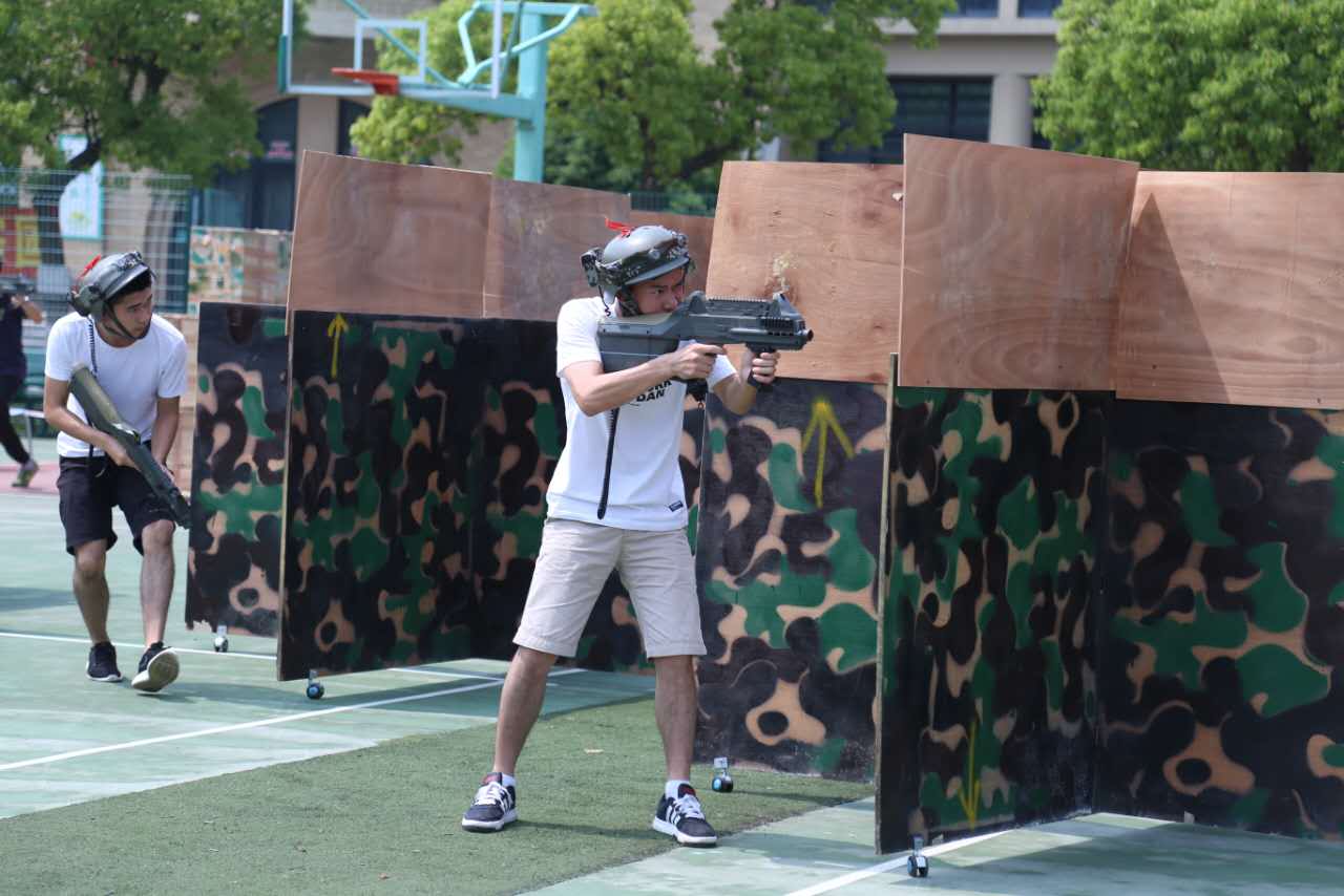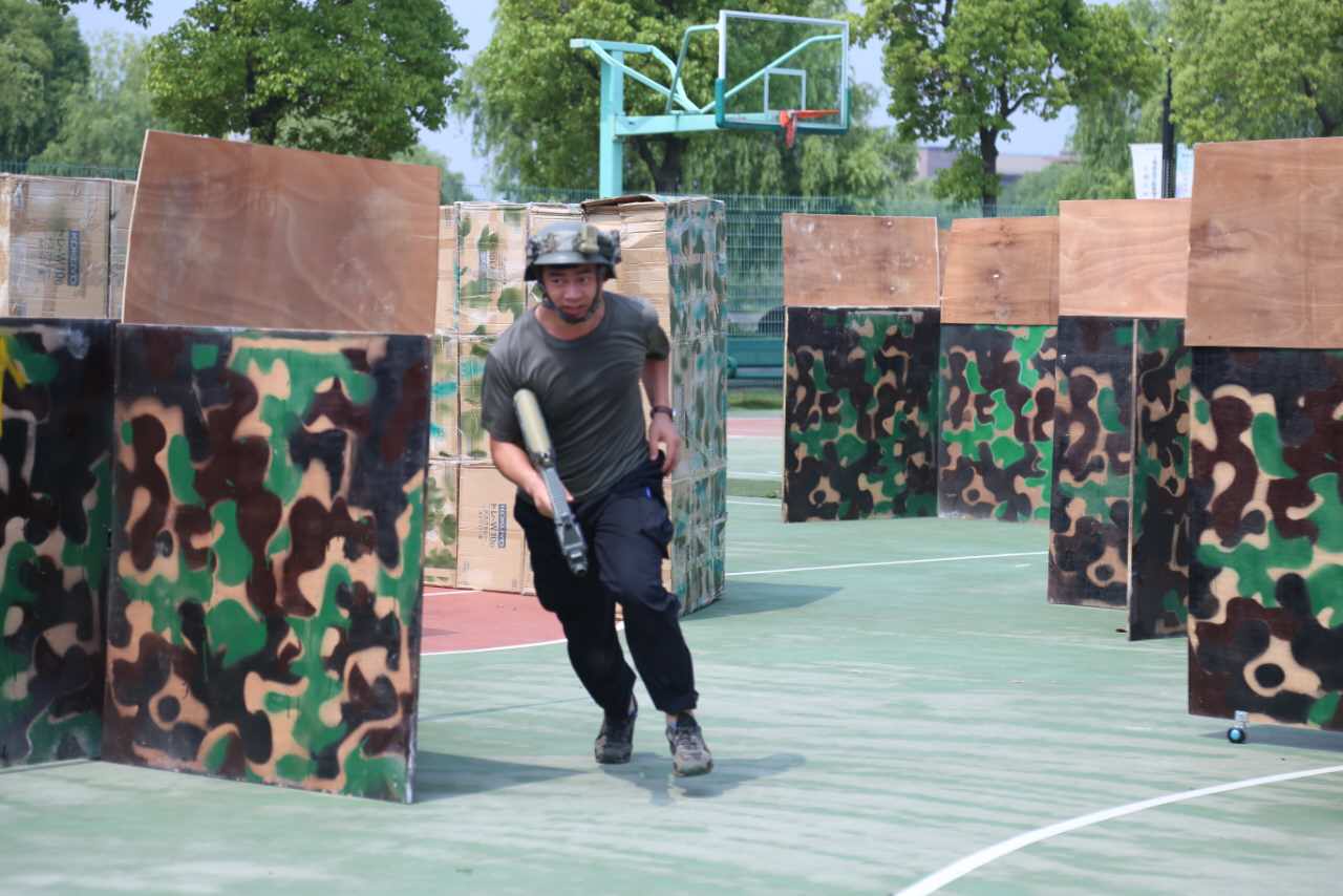 伴随着现场工作人员的一声令下,激战开始。前来参赛的同学们不顾高温、不畏骄阳,穿戴着先进的CS装备在场地中灵活穿梭,与迷彩色的掩体融为一体。队员们相互协作、举枪射击、灵巧闪躲、占据领地……这不仅仅是一场体力的消耗,更是智慧的拼搏。