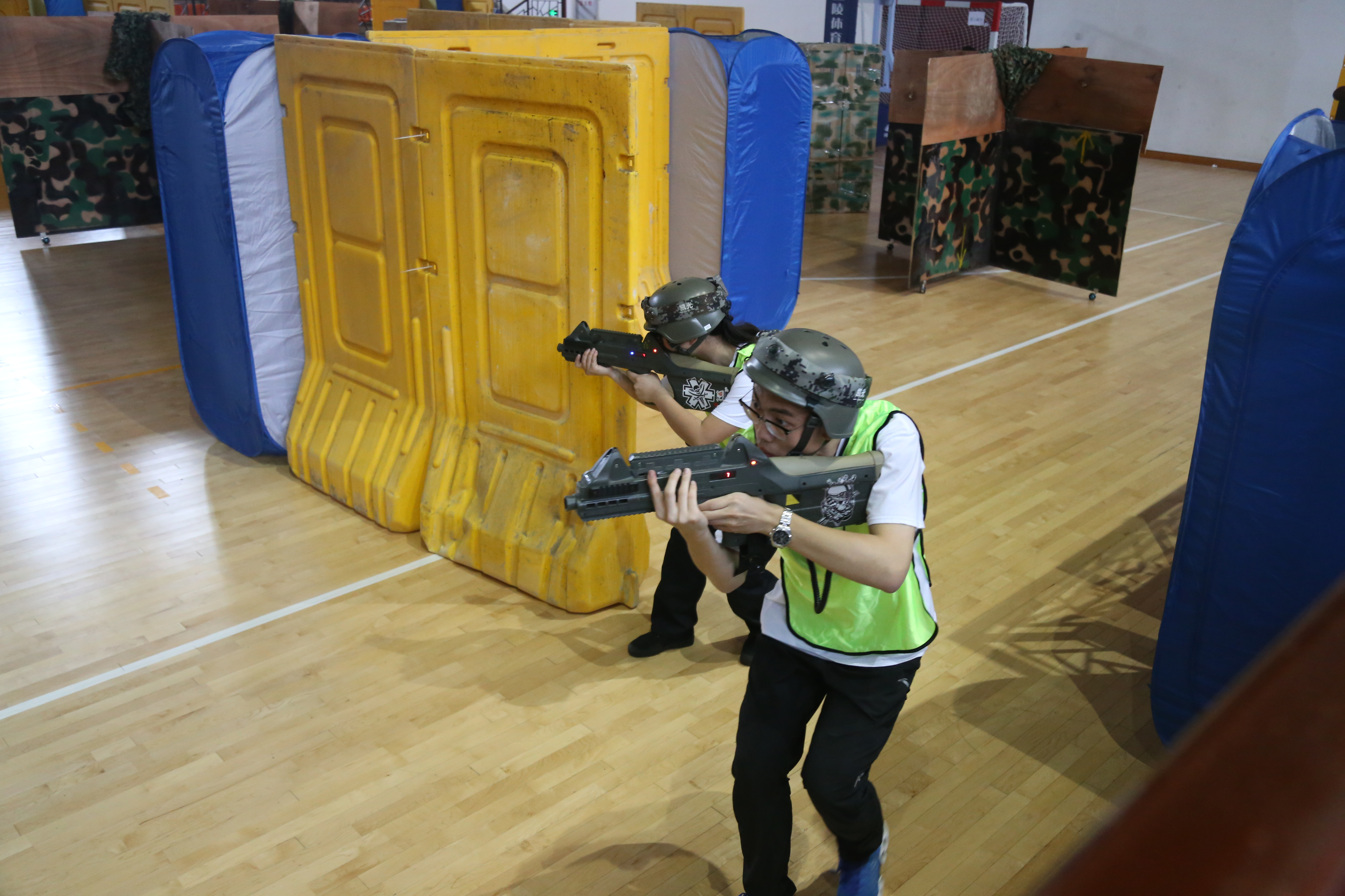 伴随着尖锐的哨声,比赛正式开始。我校队员们灵巧的身影穿梭在掩体中,清冽的枪声回响在比赛馆中,各位队员及时地给予队友提示,为最终的胜利扫清障碍。举枪瞄准、观察四周、扣动扳机、侧身躲避,这已经不仅仅是体力上的消耗,更是一场智慧的拼搏。