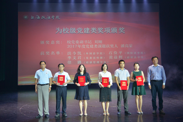 2017年度党建类课题获奖人潘高荣宣读校级党建类奖项(优秀主题党日、组织生活观摩案例)颁奖词,获奖代表是外国语学院洪令凯、国际法学院石俭平、党委宣传部季文君、经济法学院黄益辉、经济管理学院徐璐。校党委副书记、副校长刘刚与潘高荣共同为获奖人颁奖。洪令凯致获奖感言,他认为党建工作本质上是以人为本的工作,付出真心才有收获,感谢身边的人给予自己太多的帮助。