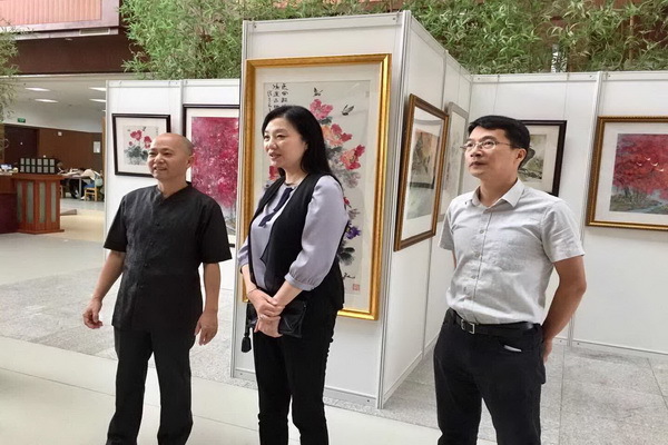 开幕式结束后,与会嘉宾进入图书馆参观书画展,观摩书画作品。