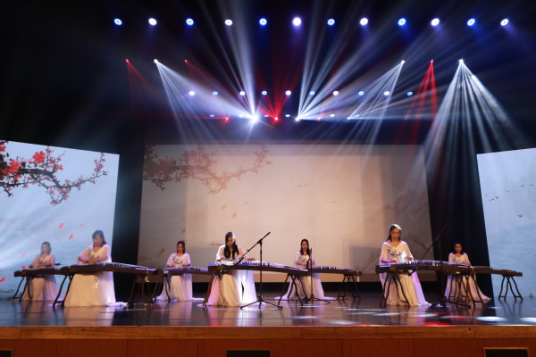 精彩的古筝表演《彩云追月》,优美的旋律从细腻的指尖流出,表达了对未来中国的美好希冀,对美好生活的无限追求。