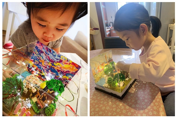 “你好!小小世界!”手工DIY由老师带领小朋友们搭建属于自己的小小世界。材料包中准备了草坪、树木、房屋、小动物等多种道具,足以满足小朋友们的奇思妙想。老师同样首先介绍了各种材料的使用方法,之后以小故事的方式亲自示范小小世界的搭建方法,并不时提醒小朋友们操作要领。小朋友们在家长的帮助下,按照自己喜欢的样子,小心翼翼地创作属于自己的追梦乐园。