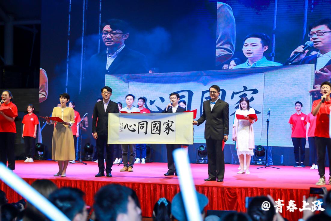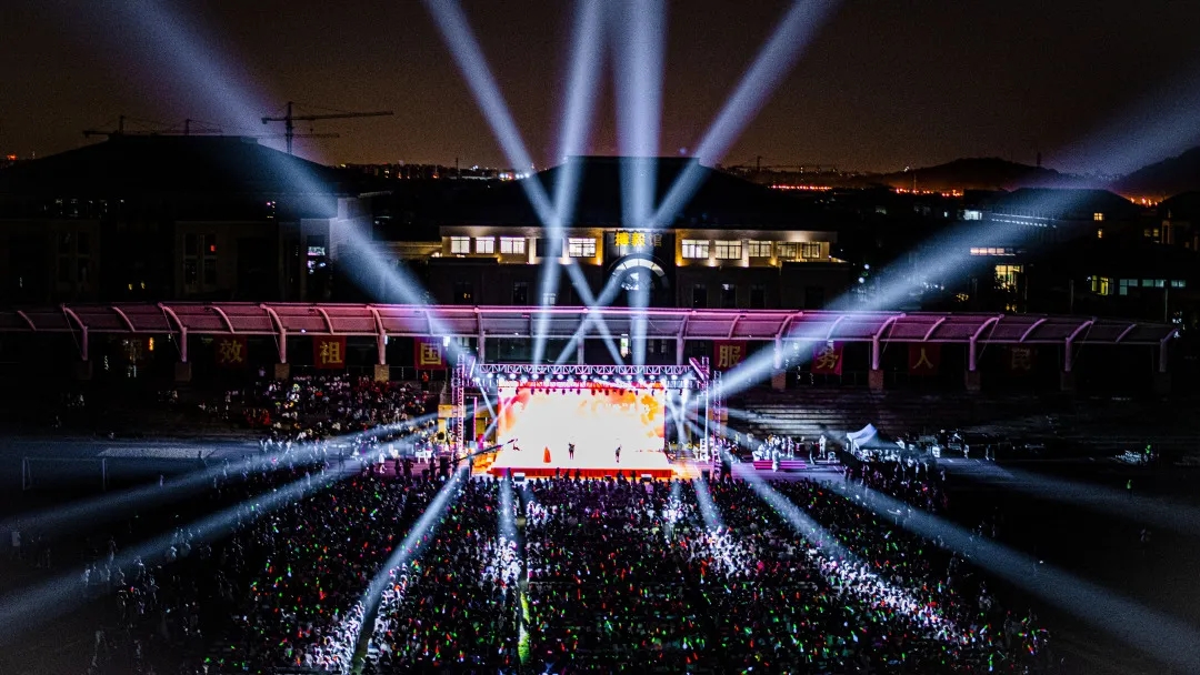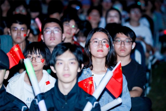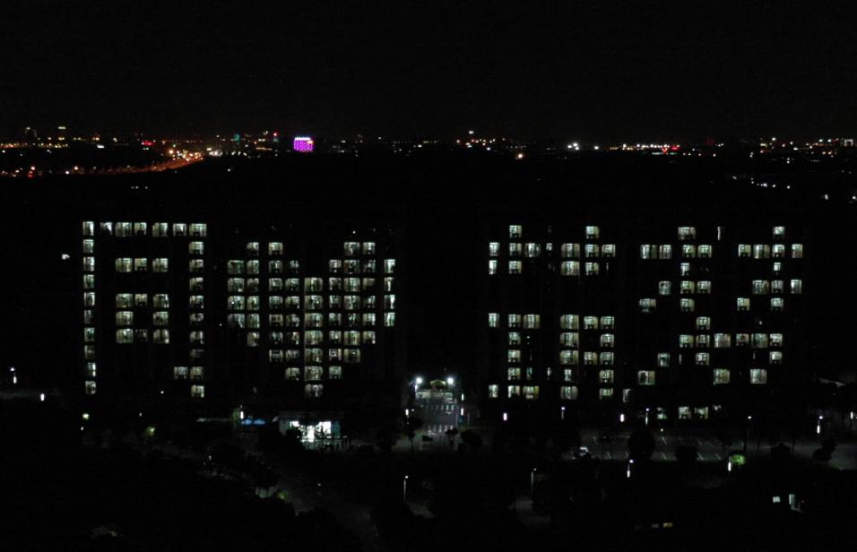 晚会的最高潮出现在“青春告白祖国”环节。2829号学生宿舍楼的1530名同学,用寝室灯光先后拼成“中国有我”“同❤筑梦”字样,向祖国母亲献上生日祝福。当直播信号出现在晚会现场时,全场一片欢腾。