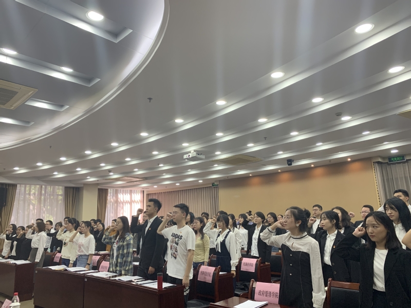 语言文化学院英语1743班徐梦婷同学作为学员代表发言,法律学院知识产权1742班陈思旭同学带领全体学员进行宣誓。