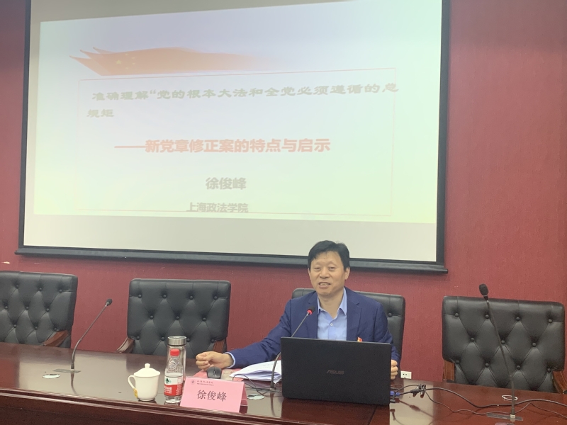 随后,徐俊峰作“党的根本大法和全党必须遵循的总规矩——新党章修正案的特点与启示”专题党课,课程主要从新党章的发展历程概述、新党章修正案提出的背景、新党章修正案的新变化、特点以及启示五个方面展开,对新党章修正案进行了剖析,帮助学员们深入理解党章。课程最后,徐俊峰结合自身经历对全体学员们提出新要求,希望学员们强化理论学习,不断提高个人修养,在实践中总结经验、升华理论。