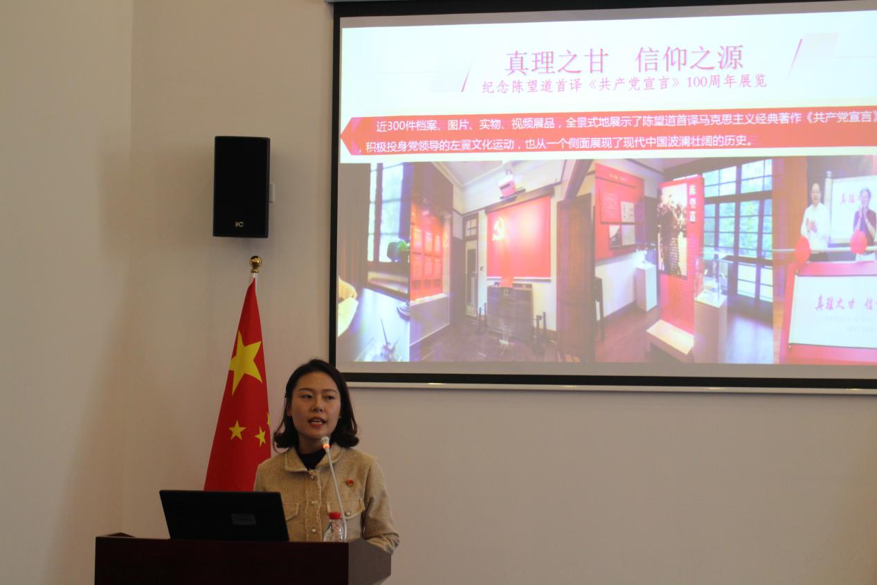“真理的味道非常甜;真理的味道为什么甜?真理的味道是否依然未减?”在第二篇章《学史明志,语言服务国家需要》中,围绕这三个主题,语院学生党支部书记潘婕生动地讲述了陈望道先生翻译《共产党宣言》中“真理味道”的由来,深刻揭示了“真理的甜味”将在社会主义制度和坚定的理念信仰所蕴含的光明前景中愈发醇厚绵长,号召广大党员特别是青年党员追随陈望道老先生的脚步,在学思践悟中坚定理想信念,在奋发有为中践行初心使命。