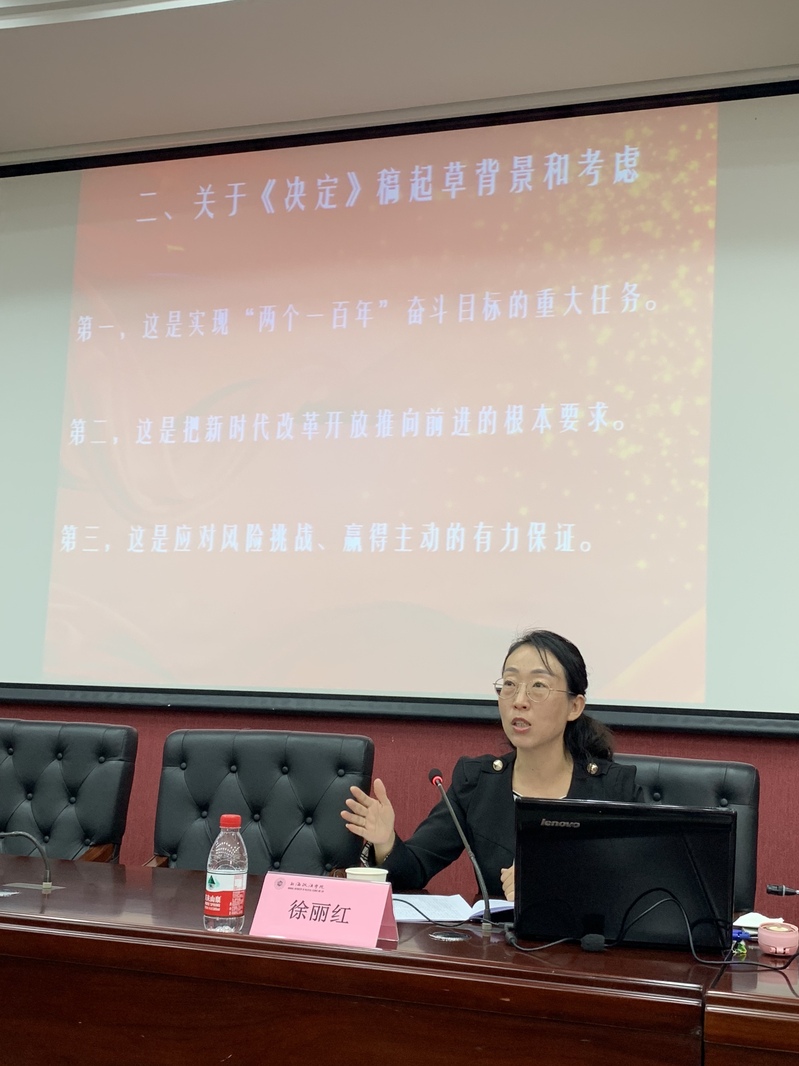 徐丽红为培训班学员讲授题为“彰显‘中国之治’优势 部署‘中国之治’任务——深入学习领会十九届四中全会精神”的专题讲座。讲座从会议成果、关于《决定》稿起草背景和考虑、问题和思考三个部分探讨十九届四中全会精神,着重从如何理解“中国之治”、两个重要提法、如何理解国家治理体系和治理能力现代化、如何看待十三个“坚持和完善”四个问题出发,结合此次抗击疫情阻击战,旨在让同学们加深对十九届四中全会精神的理解,进一步了解制度的重要性,更深刻地认识到中国特色社会主义制度的优越性。