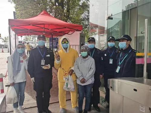 艾文静(左)和其他留学生为学校保安师傅送面包