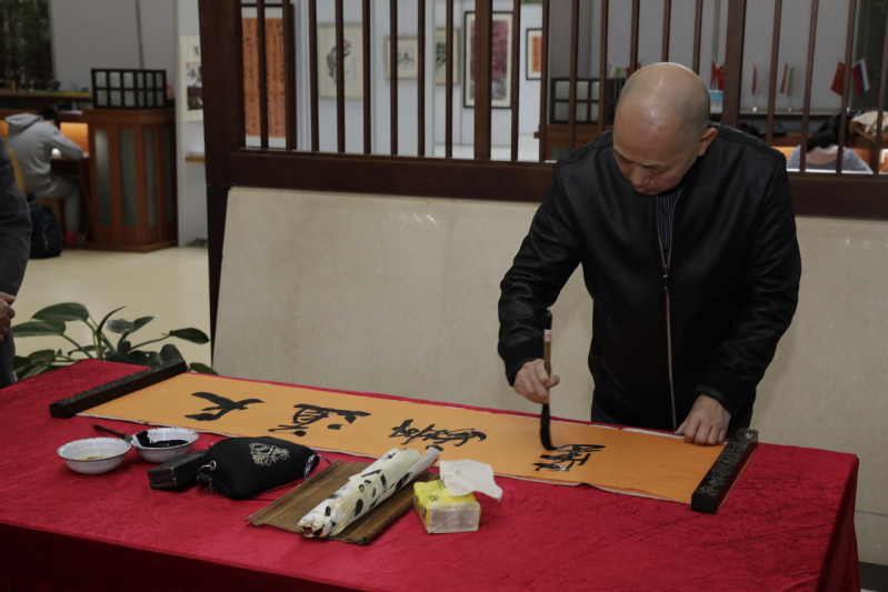 仪式上,陈志宏还向我校赠送了校训书法作品——“刻苦求实 开拓创新”,并现场泼墨挥毫,为学校题赠“天道酬勤”。师生们驻足流连于作品前,倾听陈先生讲解,轻品慢赏,意味无穷。