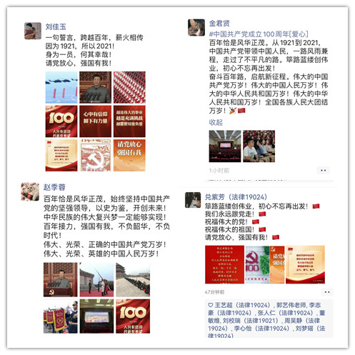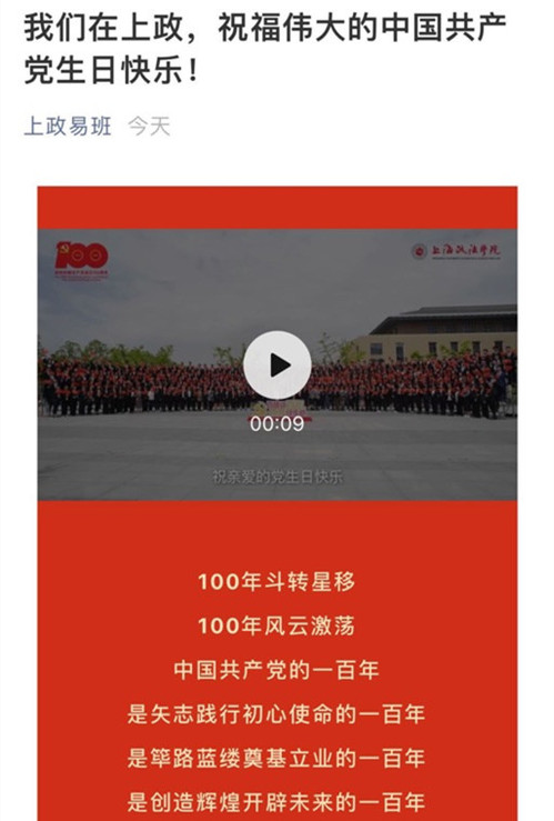 在学校师生的朋友圈里,一条“我们在上政,祝福伟大的中国共产党生日快乐!”的微信推送在清晨刷屏网络,不到两小时,点击量便过万。除此之外,校园里随处可见的横幅、道旗、展板,校园网上的大幅图片,让“野马浜”披上节日的盛装。
