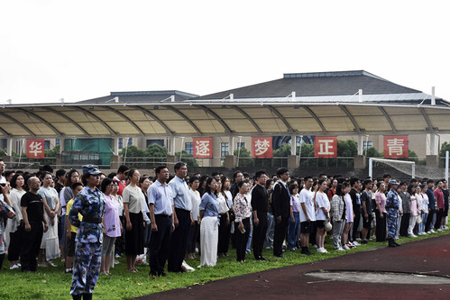 迎着清晨的朝阳,由学校军魂团学生组成的国旗护卫队,护送着鲜红的国旗,昂首阔步走向国旗台。伴随着雄壮的国歌声,鲜艳的五星红旗冉冉升起,500余名师生怀着无比崇敬的心情向国旗行注目礼,表达“请党放心、强国有我”的豪情。