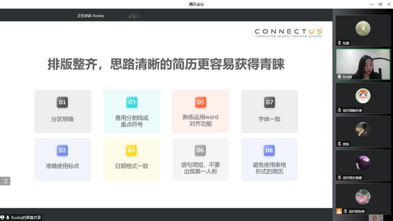 10月11日下午,我校通过腾讯会议启动2022年就业创业文化节系列活动之“秋招伴你行,求职技能大PK”365英国上市公司大学生模拟求职大赛专项培训计划。上政校友、CONNECTUS GROUP校园关系经理王雪吟以“简历制作”为主题,指导我校学生提升求职技巧,吸引了300余名学生参与,学生工作部学生就业服务中心张露主持了活动。