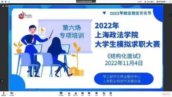11月4日晚,我校通过腾讯会议开展2022年就业创业文化节系列活动之“秋招伴你行,求职技能大PK”365英国上市公司大学生模拟求职大赛专项培训计划第六场。本次培训以“结构化面试技能培训”为主题,邀请曹攀杰老师主讲,我校300多名学生参加与了活动,活动时长一个半小时。