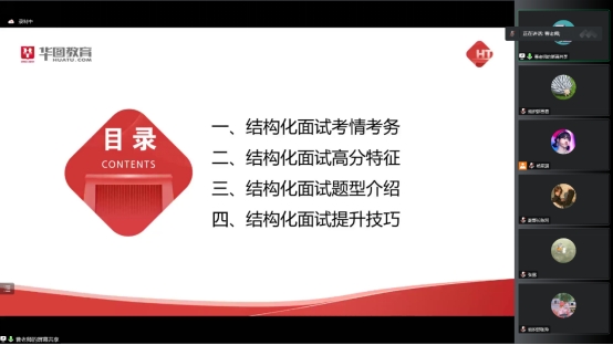 在培训中,曹攀杰从结构化面试考情考务、结构化面试高分特征、结构化面试题型介绍、结构化面试提升技巧这四个板块展开讲授。曹攀杰详细介绍了结构化面试的流程,并提出了结构化面试各个环节中的注意事项。随后,他结合具体案例,针对结构化面试的不同题型分别做了举例说明。