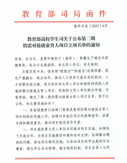 近日,教育部发布了《教育部高校学生司关于公布第二期供需对接就业育人项目立项名单的通知》(教学司函〔2023〕6号),我校申报的“通过校企协同育人推动政法院校实现更高质量就业的实践探索”等3个项目全部立项,其中就业实习基地项目2项、人力资源提升项目1项。