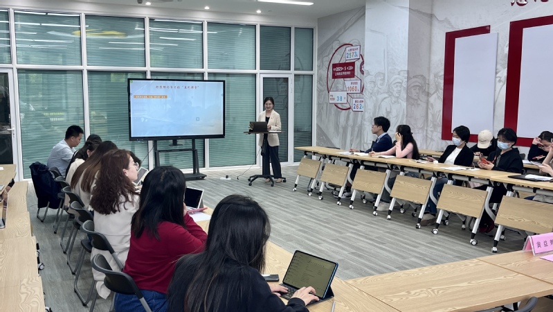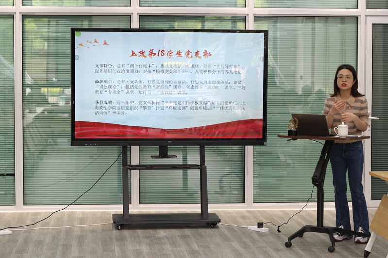 在经验分享环节,上政第18学生党支部书记裘欣璐以“学思践悟·四色课堂——学习型党支部育人模式探索”为主题,介绍了支部在“四色课堂”品牌项目、创新“党员导师制”、模拟党支部等多样化途径建设服务型党支部的过程,分享了将党建创新落到实处的实践路径。上政第10学生党支部书记焦舒以“深学细悟明法治,踔厉奋发重实践”为主题,分享支部以体制机制规范管理、结合法学专业开展理论学习、通过学科竞赛提升实践能力的建设机制,从发挥支部学生党员专业特色的角度阐述了以党建引领法治事业建设、促进学生成长成才的宝贵经验。