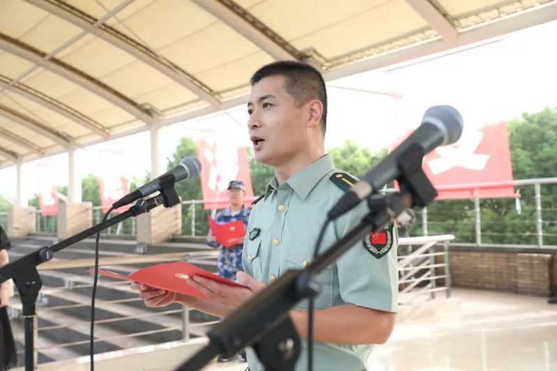 三营营长魏磊代表全体带训教官发言“遵守纪律 服从命令 以身作则尽职尽责坚决圆满完成军训任务”
