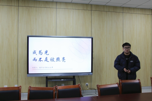 11月16日下午,“腾飞计划”学员班于成德楼A313会议室开展第三期“朋辈成长营”主题活动。主讲嘉宾、经济法学院学生王力甲,“腾飞计划”学员班班主任颜涵及部分学员参加本次活动。