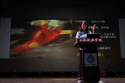 随后,她分享了第二个小故事。在2002年的盐湖城冬奥会,她在短道速滑500米的赛道上为中国冬奥军团斩获首金,在这荣耀的背后,其实也充满坎坷。在前两天进行的1500米的项目是杨扬的优势项目,四年内未逢敌手,状态爆棚的她被认为是夺冠的最大热门,然而在心态失衡的作用下,杨扬输了,甚至没有获得奖牌。走下赛场的她信心全无,觉得一切都完了,后面的比赛也完了。面对团队的激励、队友的信任,杨扬迅速调整心态,放下包袱,获得了成功。她鼓励同学们:“人们输掉他们的梦想,不是因为缺少天赋,而是缺少面对失利的勇气,以及对责任的担当”。