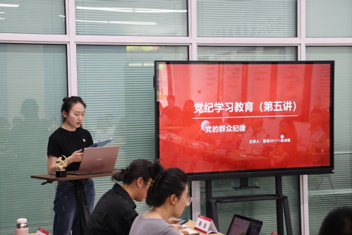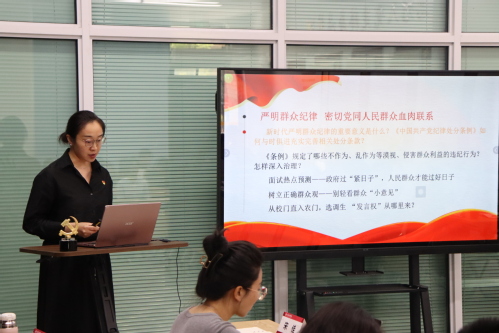 程诗媛着重介绍了群众纪律的历史渊源和发展过程,强调严明群众纪律,就是要密切党同人民群众的血肉联系。程诗媛通过阐述群众纪律的总则和具体内容、分享其自身实习经历,阐明学习群众纪律,学习党纪党规,归根结底也就是要学习如何更好地、发自内心地服务他人,厚植为民情怀,牢记初心使命。