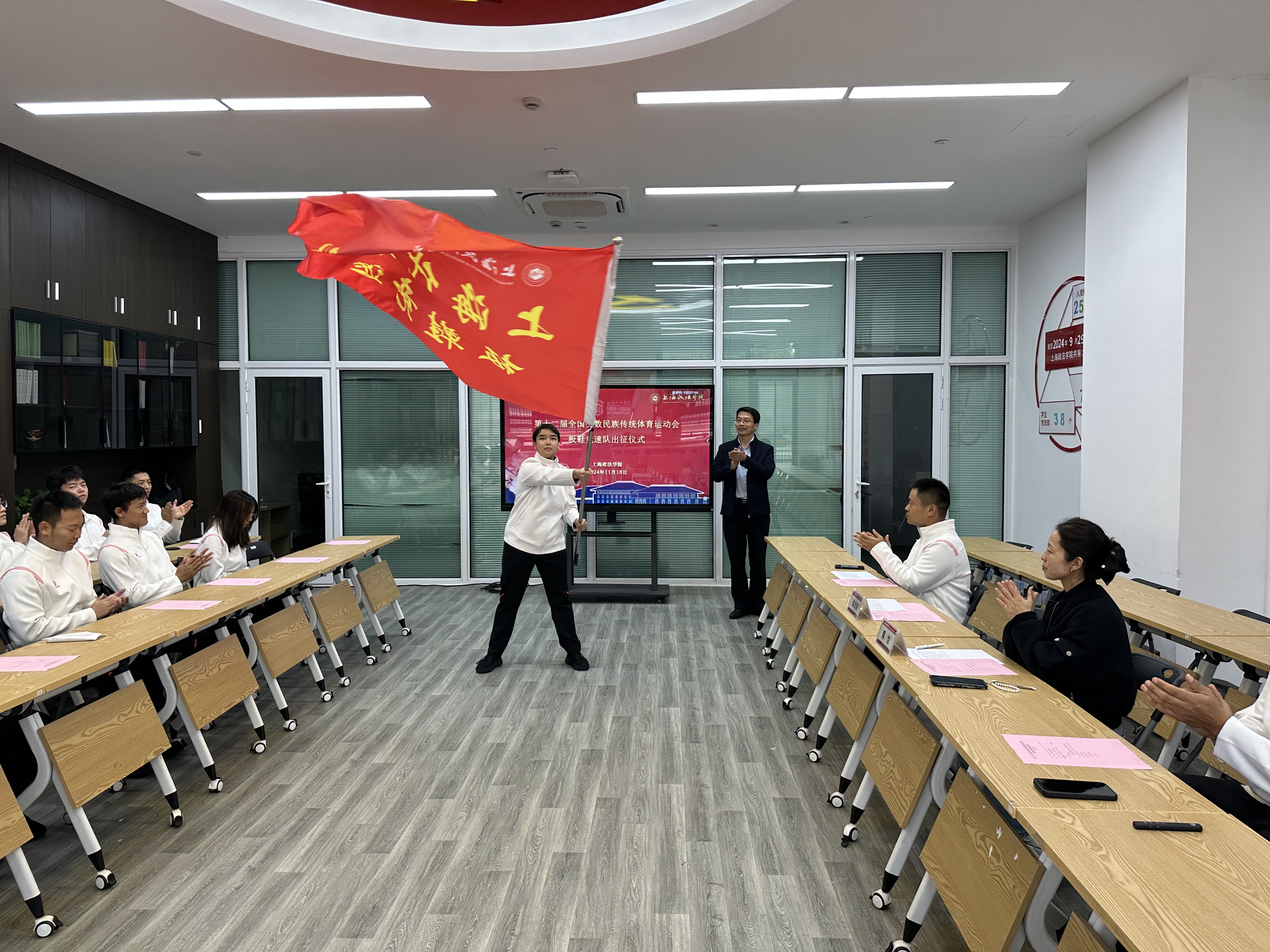 高志刚为运动员代表拜尔娜授旗、赠送出征物资,并发表讲话。他充分肯定了运动员们的精神风貌,并向各位同学的辛勤付出表示感谢。他表示,全国少数民族传统体育运动会是由国家民委和国家体育总局联合主办的大型综合性体育运动会,我校此次代表上海参加板鞋竞速项目,既是一份荣耀,也是一份责任。他向在座的运动员们提出四点希望:一是提高站位,凝聚共识。必须站在国家的高度,以强烈的责任感和使命感,去迎接这场挑战,去展现我们最好的一面。二是尊重对手,文明参赛。要尊重每一位对手,遵守比赛规则,展现良好的体育道德风尚和我们上政学子的风貌。三是传承文化,增加友谊。通过比赛,不仅要展示个人的体育才能,更要成为传播民族文化、增进各民族间友谊的使者。四是安全第一,健康为先。在追求成绩的同时,务必注意个人安全,保持良好的身体状态,确保比赛顺利进行。