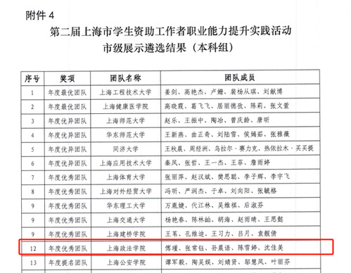 近日,“第二届上海市学生资助工作者职业能力提升实践活动市级展示”获奖榜单正式揭晓,我校学生资助工作团队获评“年度优秀团队”。本团队由学(研)工部(处)副部长柯心担任领队,学生资助奖励中心傅瑾、沈佳美,二级学院资助条线辅导员张常钰(刑事司法学院)、孙晨语(政府管理学院)、陈雪婷(经济管理学院)组成。