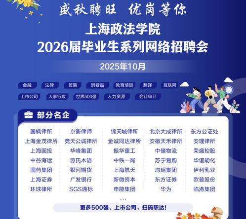 在单位邀约方面,本次招聘会实现“行业覆盖+区域联动”双突破:参会企业涵盖法律、科创、政企、金融等领域,包括48家优质律所与法律机构、40余家国企及上市公司,以及聚焦数字法治、智能风控的人工智能与科创企业专区。特邀青浦区就业促进中心携长三角地区优质企业入驻,并开通专属岗位通道,为毕业生提供“立足上海、辐射长三角”的多元化就业选择。