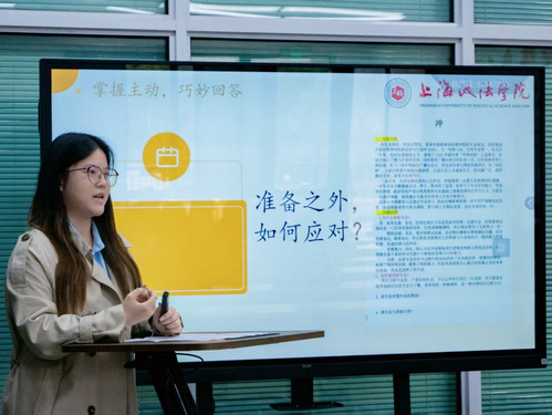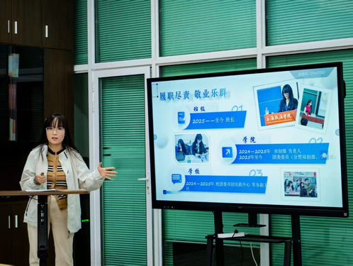活动伊始,余雯悦以“‘余’你分享——面试与答辩小技巧”为题,聚焦面试准备与表达技巧,结合多次面试经历,演示如何通过结构化表达与精准内容设计提升综合表现。在答辩环节,她从讲稿逻辑、时间把控与PPT呈现三方面提出具体建议,更巧妙以“余悦”谐音“鱼跃”为引,以“海阔凭鱼跃”之意象串联内容,增强表达感染力与记忆点。她鼓励同学们在实践中勇于尝试,以每一次得体表达书写自己的精彩篇章。