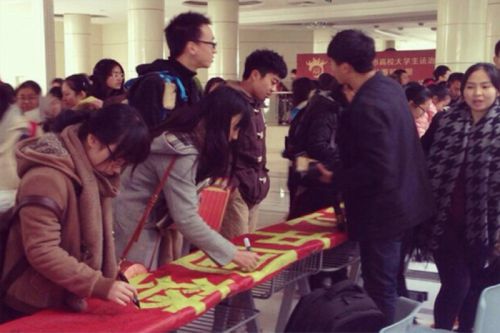 届时,长达八米印有“三十载春秋,伫立中国梦”红底黄字的签名祝愿横幅被平铺在大厅中的桌子上,吸引了大批上政学子驻足签字,前来为校庆表达一份衷心的祝愿。而每一位参与签名祝愿活动的上政学子都将获得一张精美的明信片作为纪念品,对于有需求的同学可以当场将各种心愿祝福话语写在明信片上,然后交给这次举办活动的团支部及团学干事为其免费寄送至目的地。活动中,我院校庆祝福口号一声声缭绕在庸夫楼。