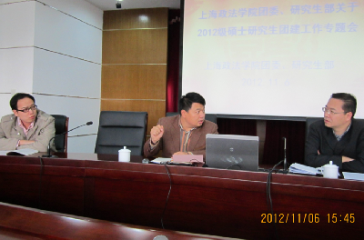 研究生部主任潘牧天教授对我校2012级硕士研究生团建工作提出以下几点希望:一是希望研究生团建工作以“有利于研究生顺利毕业和充分就业”为切入点,注重提升研究生的自身学术水平和社会适应能力;二是希望凭借团委开展研究生团建工作提供的平台,充分挖掘司法行政系统的各种资源与便利条件,为研究生适应各种社会工作奠定基础;三是希望研究生团建工作开展过程中高度重视团学活动的层次与质量,着重突出学术性和拓展性。