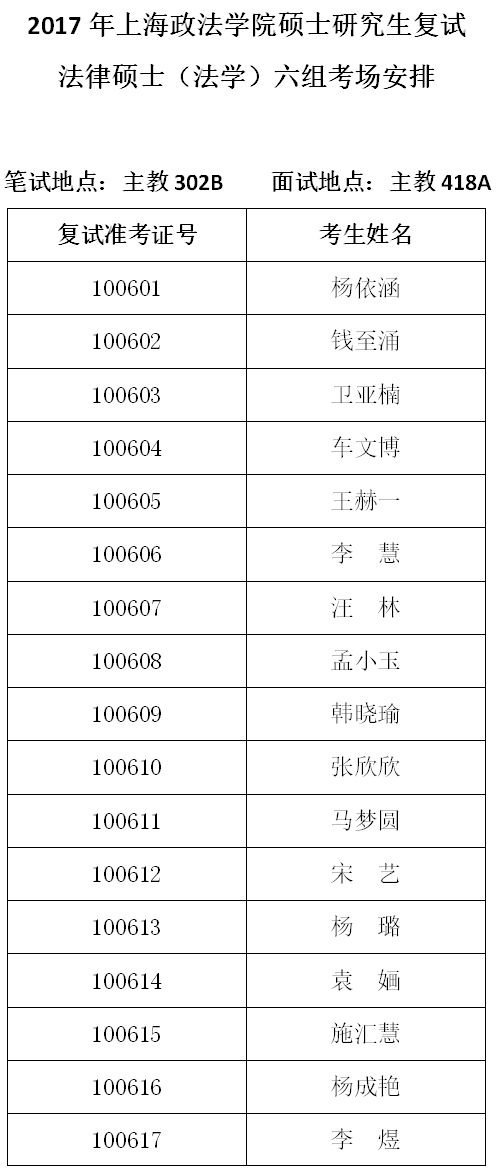 10-6法律硕士(法学)六组考场安排