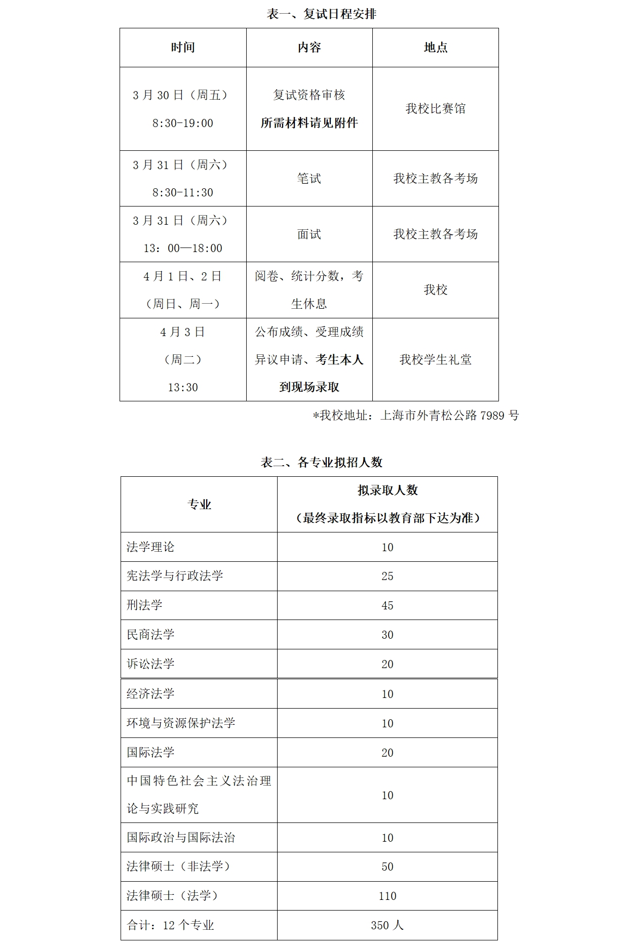 根据教育部、上海市教委对2018年硕士研究生复试的有关规定,结合我校实际情况,我校拟于2018年3月30日、31日两天进行2018年硕士研究生招生复试,3月30日(周五)进行复试资格审核,3月31日(周六)进行复试;4月3日(周二)进行现场拟录取,具体安排见表一。复试内容以我校研究生处官网上发布的“2018年硕士研究生招生简章”为准。我校在“中国研究生招生信息网”(http://yz.chsi.com.cn)进行调剂的时间为:2018年3月23日-3月27日。请在“中国研究生招生信息网”调剂意向采集系统填报我校调剂意向,已向我校发送预调剂申请的同学务必在3月27日18:00之前在研招网调剂服务系统填报调剂志愿,取得我校复试资格必须以研招网调剂系统发送的复试通知为准。上述日期为预计日期,如有变化,我校将在研究生处官网、上政研会微信公众号提前通知,请考生务必随时留意,每日查看。
