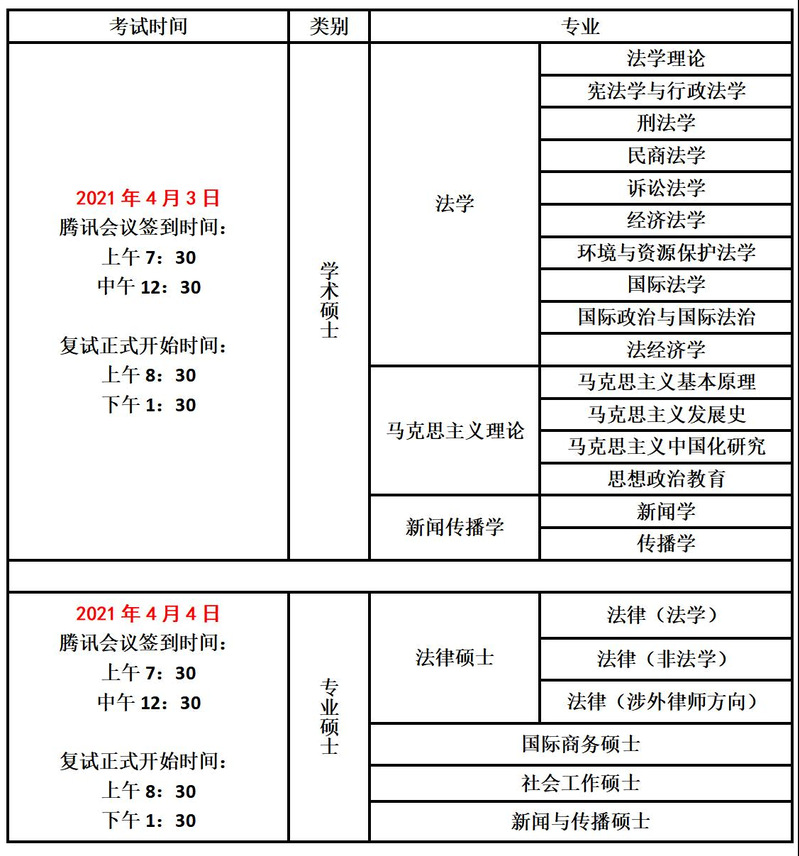 复试正式开始时间为当天上午8点30分、下午1点30分。复试考生的具体面试时间以考务人员通知为准,复试专业安排以下表为准: