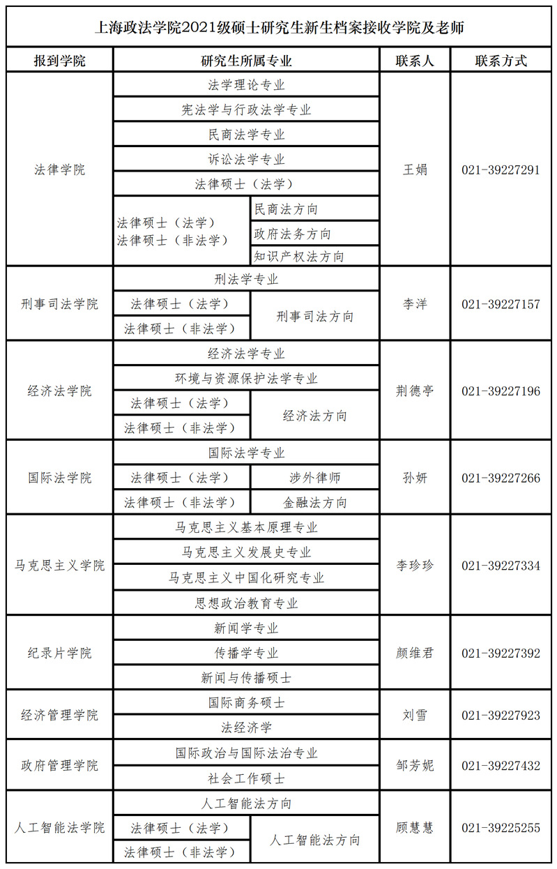 考生务必于8月30日前将人事档案寄送至我校,考生邮寄人事档案收件地址栏,务必根据录取专业填写对应的录取学院及学院接收老师(见下表),例如法学理论专业拟录取考生,收件栏地址为:上海市青浦区外青松公路7989号 365英国上市公司+法律学院+学院老师。本校2021年应届毕业生录取为我校2021年硕士研究生的同学,不需要转户口、党团员组织关系、档案。学生档案由我校各相关学院统一调取至新生录取学院。