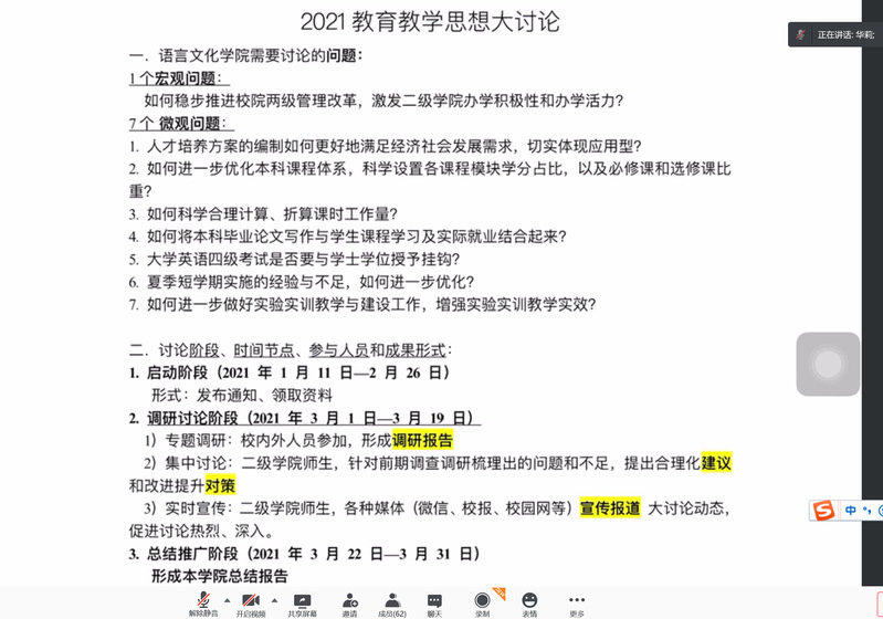 1月14日,语言文化学院线上召开教职工大会暨2021年教育教学思想大讨论动员会。学院班子成员、全体教职工参加大会,会议由党总支书记姚善英主持。