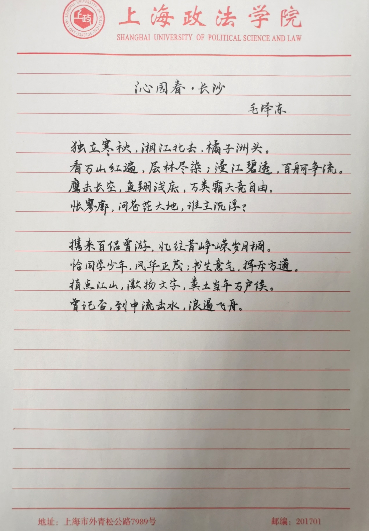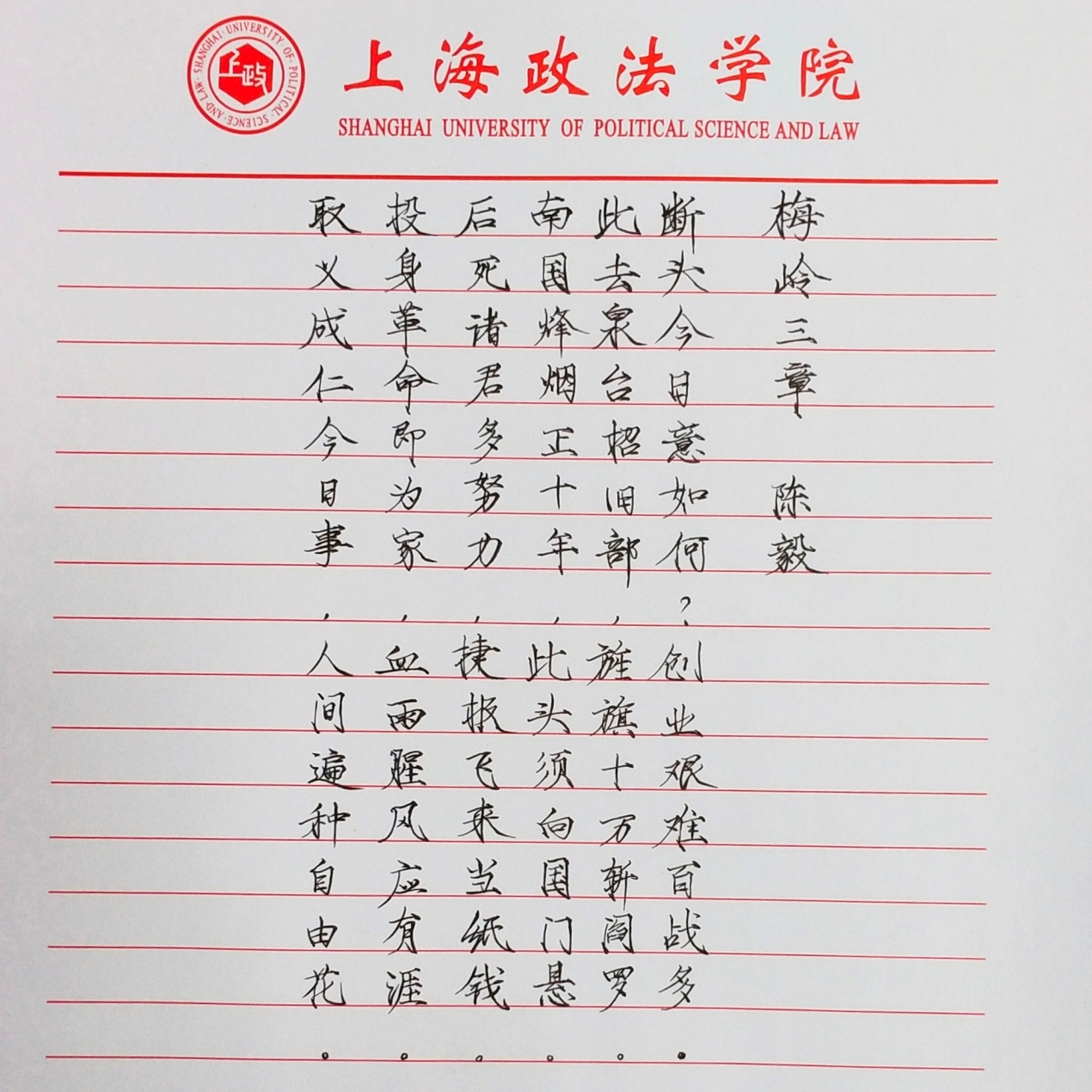 红色诗词书法展示活动圆满结束,谨以此迎建党一百年之华诞,续书法三千年之文蕴。相信,广大上政学子将在不断地学习中慢慢感悟,不忘党的峥嵘岁月和光辉历史,珍惜来之不易的幸福生活,弘扬爱国主义精神,开创更美好的未来。
