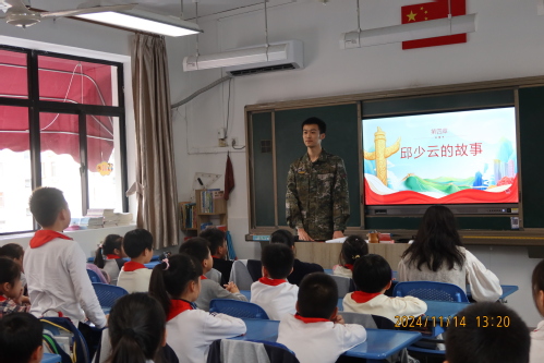 红旗工作室退役士兵代表黄天艺以“学习红色历史,传承爱国精神”为主题,跟同学们分享了抗日小英雄王二小、舍身堵枪眼的黄继光、巾帼英雄刘胡兰,以及在烈火中牺牲的邱少云的故事。通过红色故事结合知识问答的互动方式,让同学们深刻地了解了革命先烈的英勇事迹,将爱国情怀植根于心。