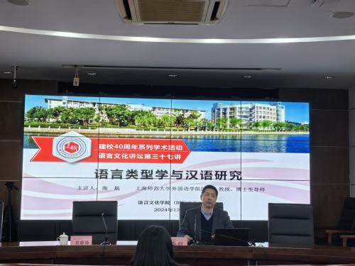 12月10日下午,语言文化学院(国际交流学院)在求实楼513举办建校40周年系列学术活动暨语言文化讲坛第三十七讲,上海师范大学外国语学院院长、博士生导师高航教授应邀为我校师生作题为“语言类型学与汉语研究”的学术讲座。讲座由汉语国际教育教研室主任翁晓玲副教授主持,学院教师及翻译硕士研究生参加。