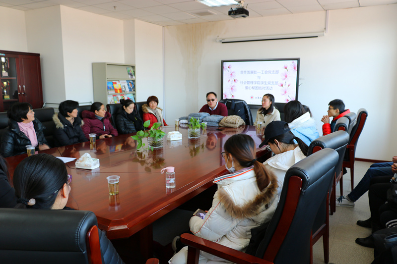 1月10日中午,合作发展处-工会联合党支部与社会管理学院学生党支部在教工活动中心306室开展爱心帮困结对活动。校工会、合作发展处、社会管理学院、校工会编织社教师代表以及部分学生代表出席了活动。