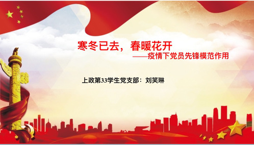 为进一步明确、领会、发挥战“疫”一线共产党员先锋模范作用,617日下午,上政第33学生党支部在腾讯会议上参加刘笑琳同志主讲的“寒冬已去,春暖花开——疫情下的党员”主题党课。
