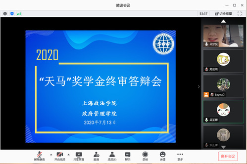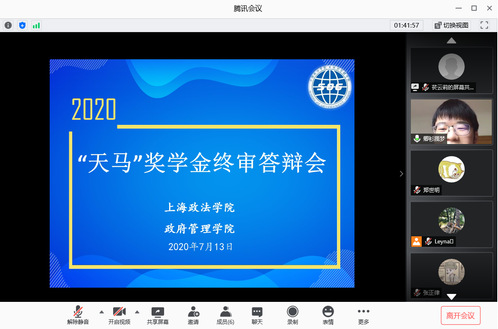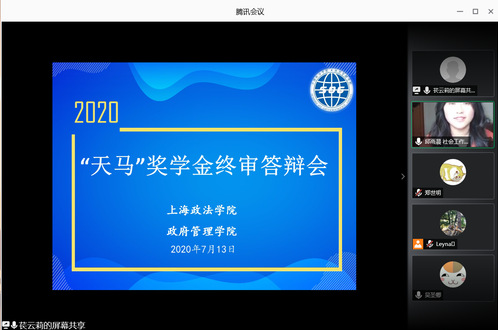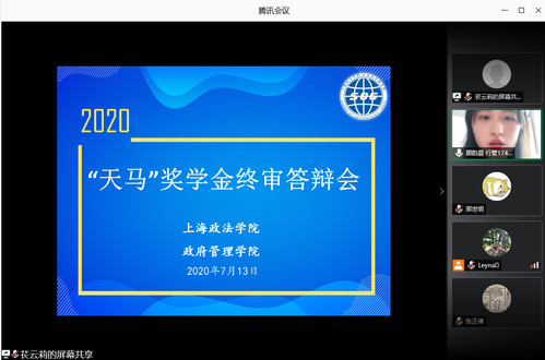 为更好、更充分调动学生奋发向上、刻苦学习的积极性,7月13日上午10时30分,政府管理学院在腾讯会议平台举行2020年“天马”奖学金终审答辩会。本次会议邀请“天马”奖学金设立人-上海市锦天城律师事务所吴圣卿律师作为终审答辩评委,政府管理学院辅导员苌云莉主持会议。