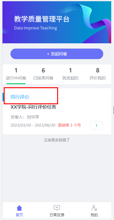 在【进行中问卷】中找到同行评价,点击同行评价问卷后进入认领页面,由老师自行认领需要评价的课程