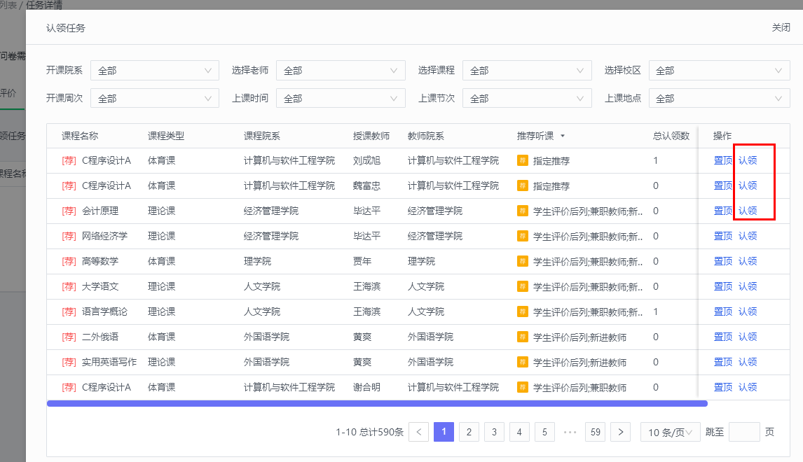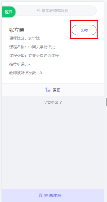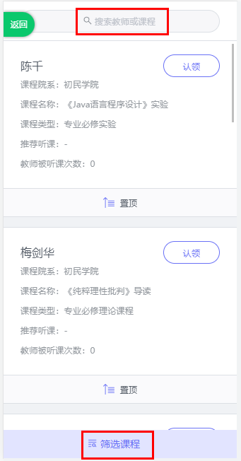 可以在下图的红框中进行课程或者教师搜索,确定要评价的教师课程后,点击认领